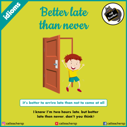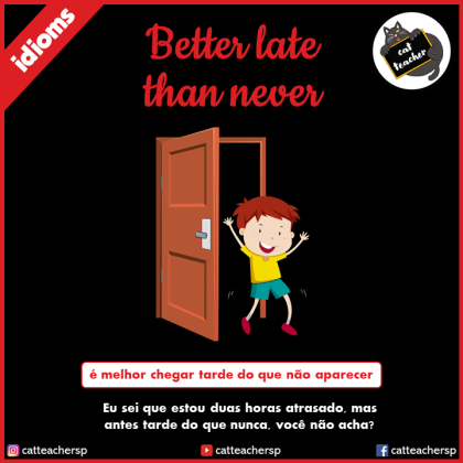 Better late than never significa antes tarde do que nunca. Usamos este idiom para dizer que é preferível alguém ou algo chegar ou acontecer com atraso do que nunca chegar ou acontecer.