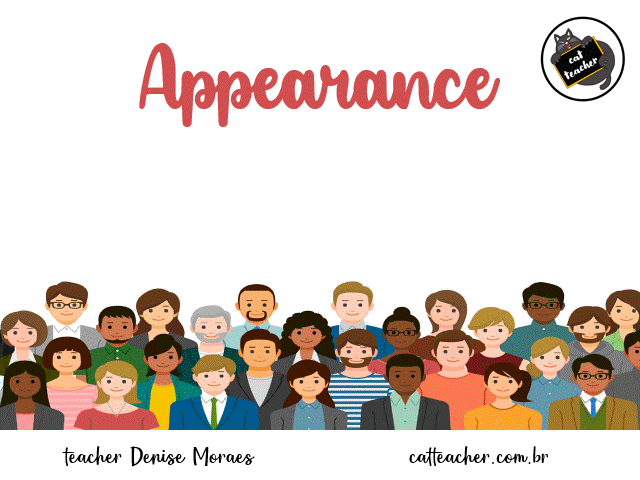 Appearance traz um vocabulário completo sobre aparência e características físicas. Também traz a descrição de partes do rosto e do corpo, cores de olhos e cabelos, além de tipos de cabelo e barba.